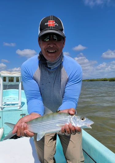 I offer guided flyfishing trips in Southern Belize. We fish off the Cayes and in the Inner lagoons. We will target Permit, Tarpon, Bonefish, and Snook. If conditions are perfect, we might be able to catch other species in the bluewater. We will be abord the Oliva, a 23' Panga that is fully outfitted with a seat on the casting platform.